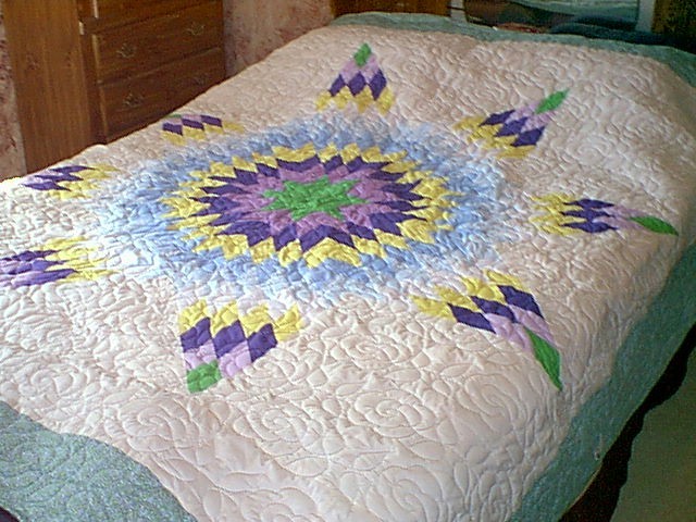 : Multi-colored star, Blue and Green border. Measures: 90"x100". Made from cotton quilting fabrics. Machine quilted in the Rose pattern for maximum durability. Machine wash and dry. (Pictured on a Queen size bed) **SOLD**