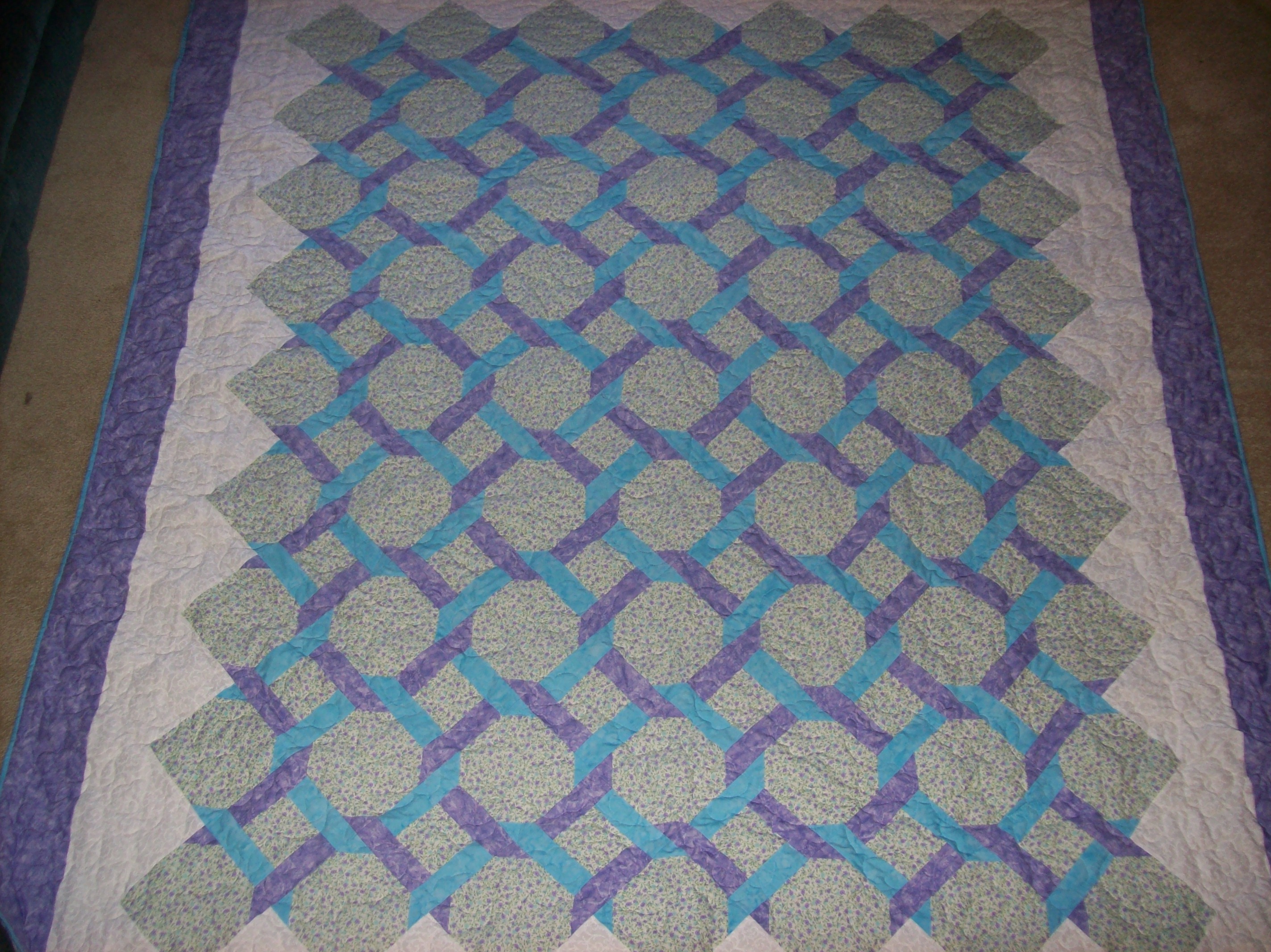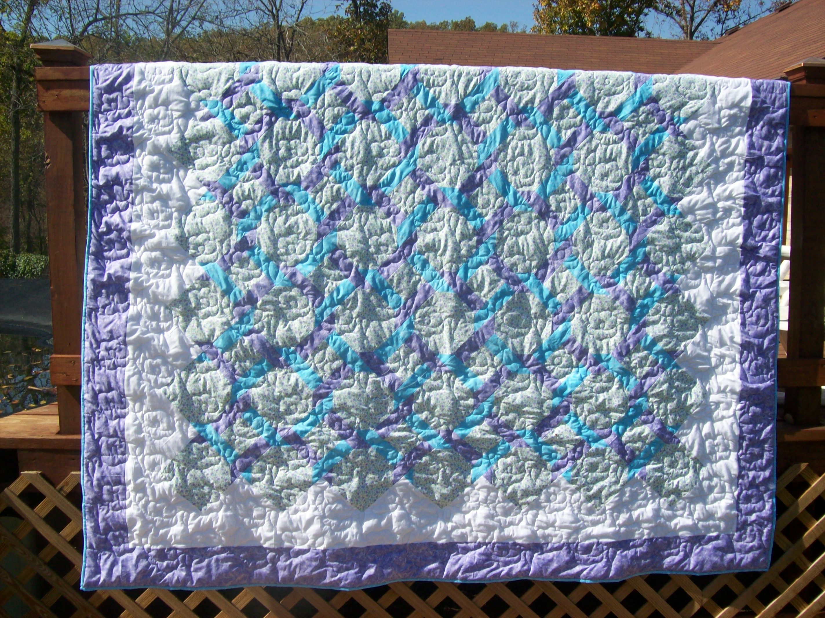 Queen Size Garden Trellis: Blue and Lavender flowered print on white cotton fabric form the background behind the coordinating blue and lavender trellis. Measures: 90"x105". Made from cotton quilting fabrics. Machine quilted in the Daisy pattern for maximum durability. Machine wash and dry. Sold