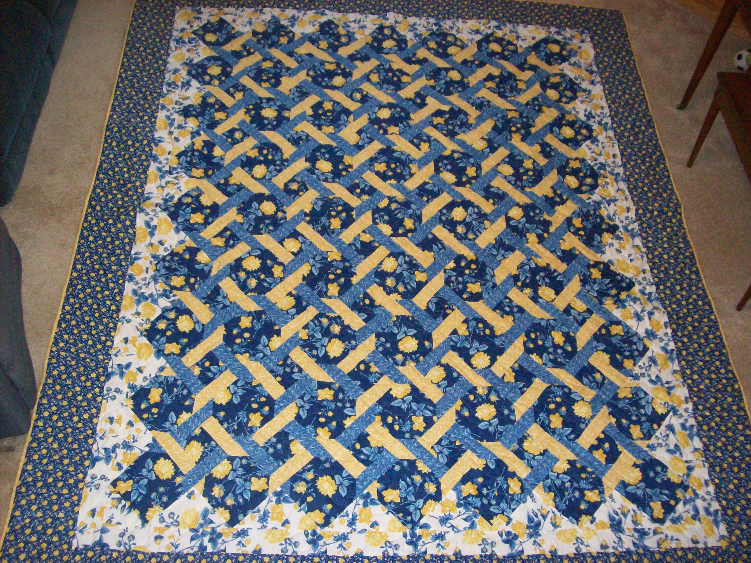 Queen Size Garden Trellis: Made from coordinating Blue and Yellow 100% cotton prints from the Chesapeake collection. Measures: 88"x110". Machine pieced and machine quilted for maximum durability. Machine wash and dry. **SOLD**